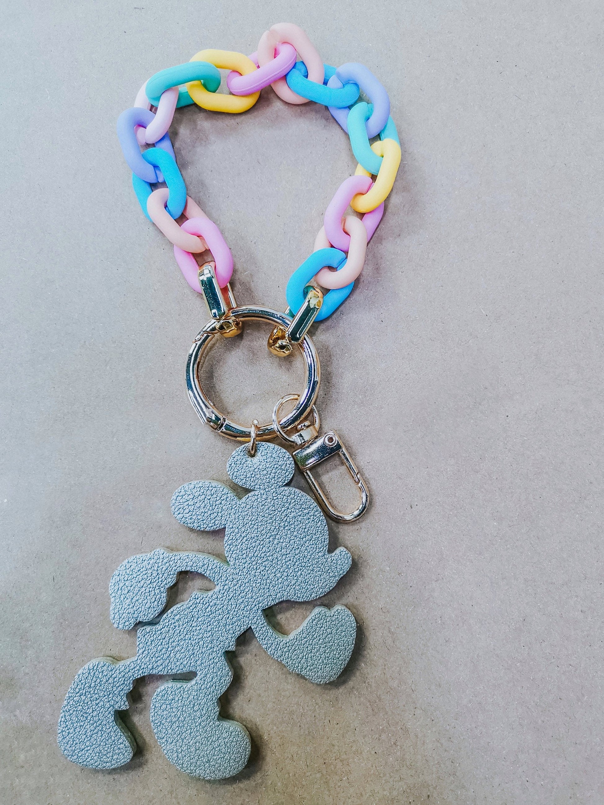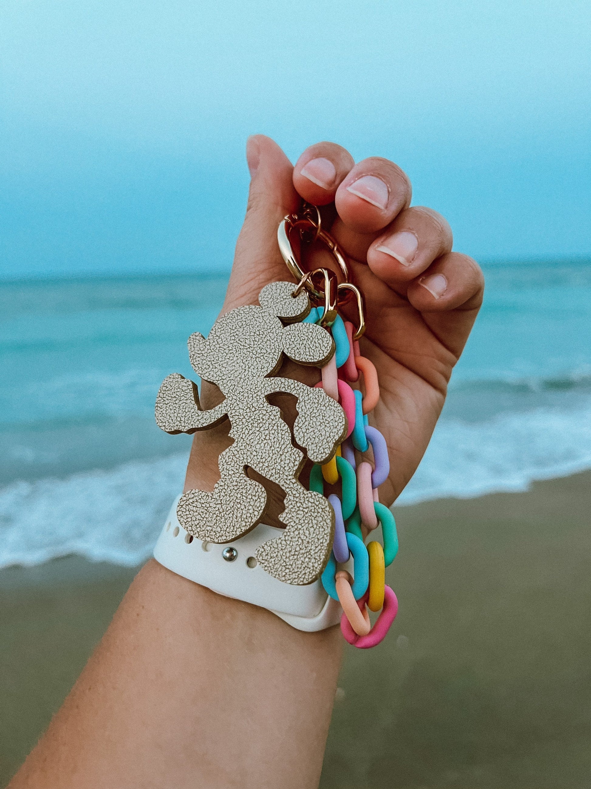 This is a gold leather keychain measuring at approximately 3”, with a .75” lobster style clasp, and an acrylic pastel rainbow chain. It’s the perfect addition to any backpack, crossbody bag or fanny pack.